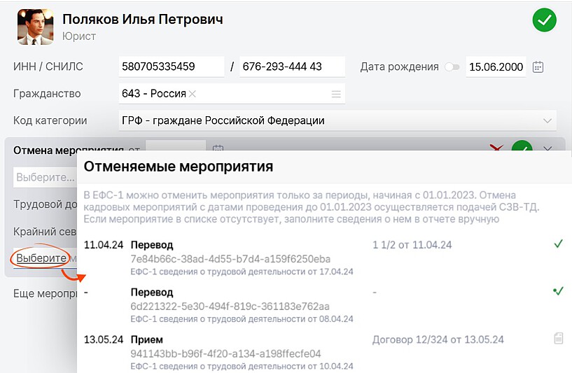 Упростили отмену мероприятия в «ЕФС-1 Сведения о трудовой деятельности». Выбрать нужное мероприятие стало легче: Saby покажет его название и отчет, в котором оно создано.