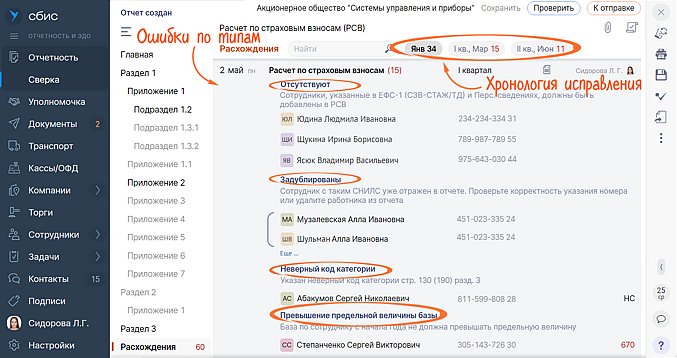 Хотите обойтись без лишней нервотрепки и отказов от госорганов — используйте сверку сотрудников. Все отсутствующие и задублированные в ней — как на ладони. Исправить ошибку можно в несколько кликов — навести курсор на сотрудника, а затем удалить или добавить его в нужный отчет.