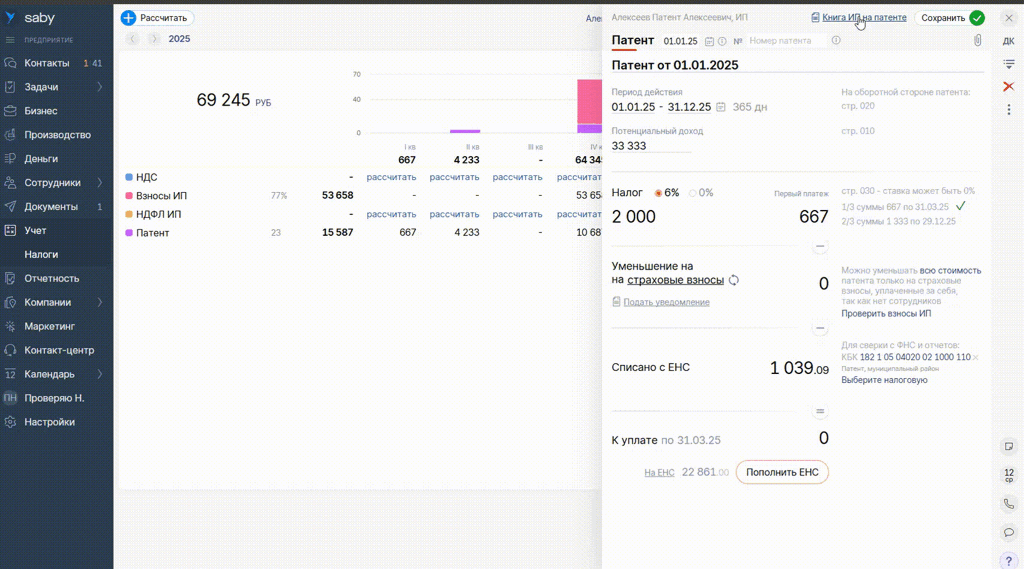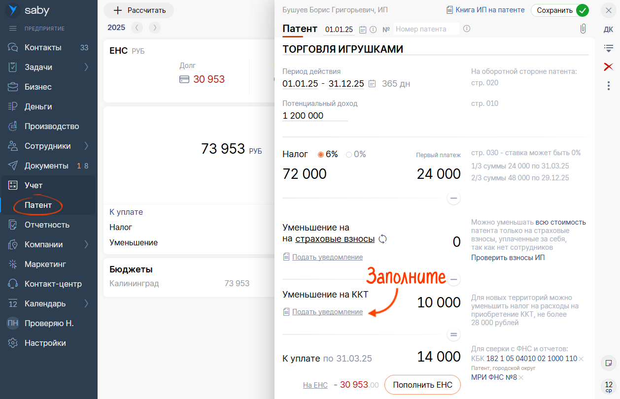 Чтобы уменьшить патент на расходы по ККТ, направьте в налоговую специальное уведомление. Возможность заполнить этот документ в Saby появится с 12.04.2025.