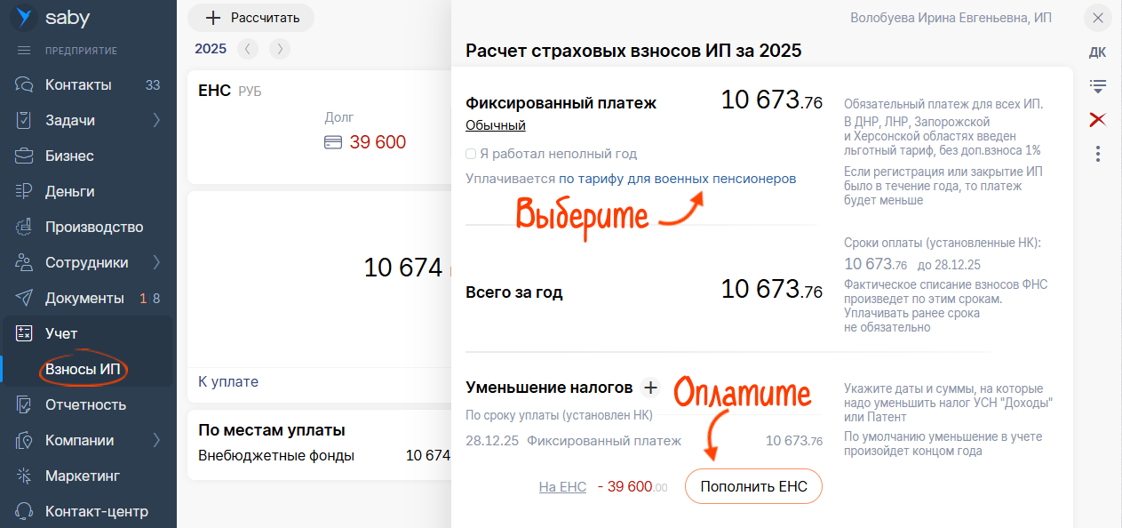 В Saby все изменения учтены автоматически. Подробнее о них — в базе знаний. С середины 2023 года военнослужащие и силовики получили право не платить взносы на пенсионное страхование. Мы учли ваши пожелания и добавили возможность расчета страховых взносов для военных пенсионеров. Изменить тариф можно в карточке расчета взносов.