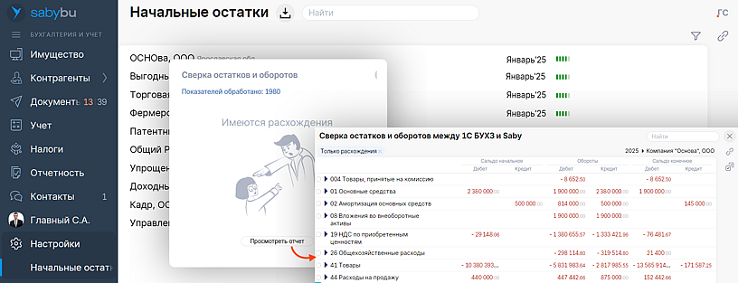 После окончания загрузки Saby предложит запустить сверку остатков и оборотов. Она покажет, по каким счетам и субсчетам есть несостыковки.