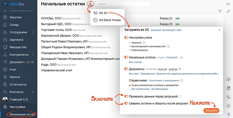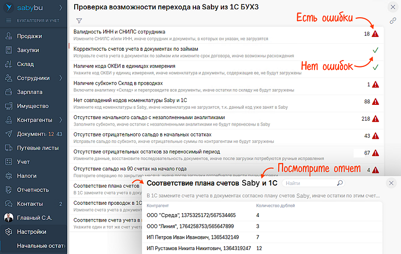 Переход из С в Saby — это просто У нас уже давно есть перенос настроек и остатков в один клик Раньше ошибки учета в С вы могли увидеть только после загрузки в нашу систему Например отрицательное сальдо на счетах ТМЦ или дубли кодов номенклатур Приходилось исправлять недочеты в 1С и загружать данные снова