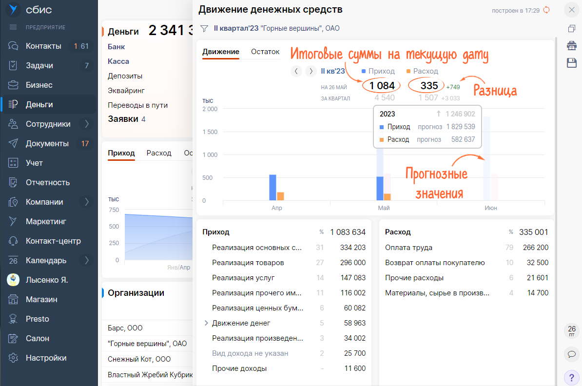 Теперь на странице можно посмотреть одновременно приход и расход, сравнивать их за разные периоды, выбирать произвольный период в днях. Добавили прогнозируемые показатели.