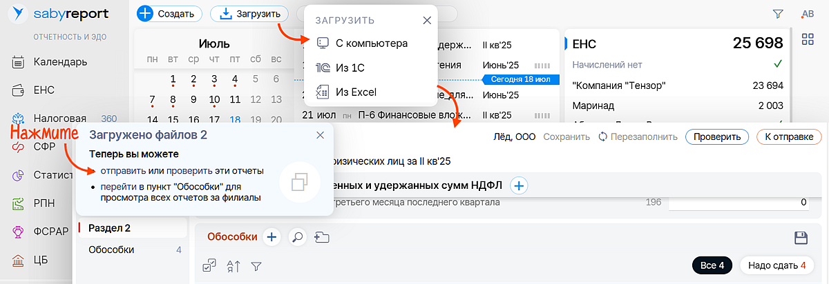 Даже если подразделений у вас сотня, нажимать сто раз «Проверить» и «Отправить» не придется. После загрузки Saby предложит сделать это сразу по всем отчетам.