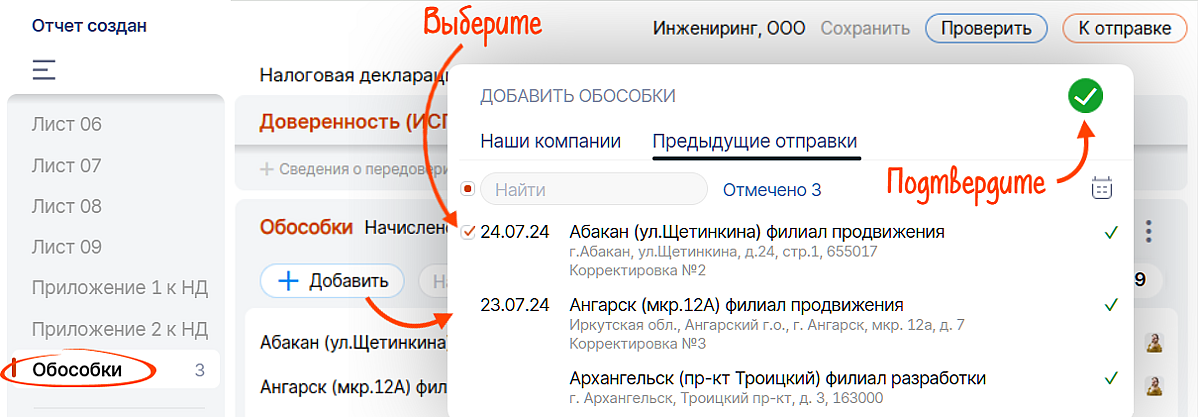 Зайдите на вкладку «Обособки», нажмите «Добавить» и выберите подразделение из предыдущих отправок.