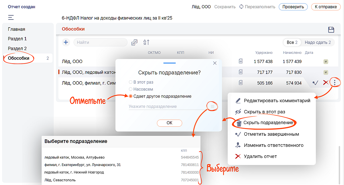 Когда у одной организации несколько ОКТМО, для 6-НДФЛ нужны отдельные расчеты по каждому коду. Просто добавьте отчет на вкладке «Обособки» и укажите нужный ОКТМО. Заполните данные по разным кодам и отправьте в налоговую.