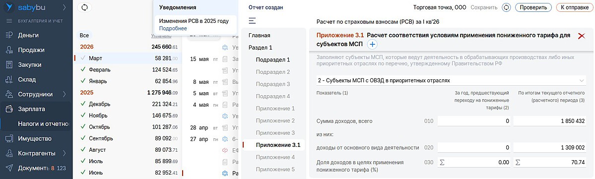 Напоминаем: даже если директор не трудоустроен и не получает зарплату, страховые взносы нужно рассчитать с федерального МРОТ (27 093 рубля). Как это сделать в Saby — читайте в статье. Начисленные СВ отразятся в РСВ (раздел 3):