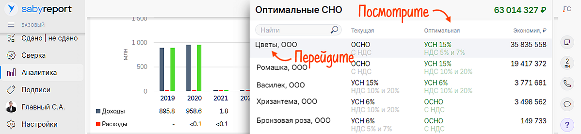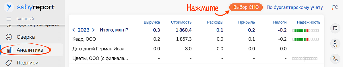 Вы всегда можете вернуться к расчетам, нажав на кнопку «Выбор СНО» в разделе «Аналитика».