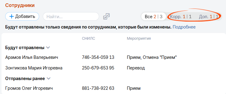Легко проверить, кого вы отправили по итогу всех корректировок. Переходить в разные редакции не придется. Общий список отправленных уже есть в актуальной версии. Удобные фильтры «Доп» и «Корр» позволят отобрать тех, по кому вы вносили правки или кого не было в исходном отчете.