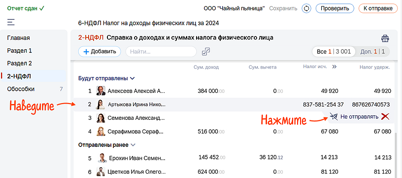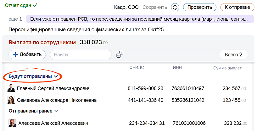 Удобно контролировать. Сотрудники с корректировками появятся в списке «Будут отправлены». Проверьте и отправьте отчет — уйдут только актуальные данные.