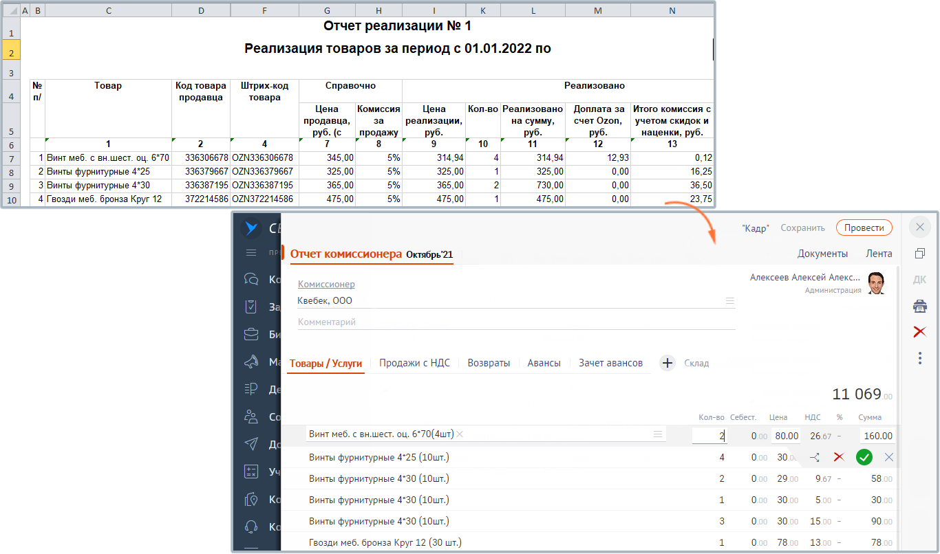 Просто загрузите отчет в формате *.xls, а СБИС создаст правильные проводки, спишет себестоимость реализованных комиссионером товаров, создаст исходящие счета-фактуры по реализациям. Или заполните отчет вручную на вкладке «Товары и услуги».