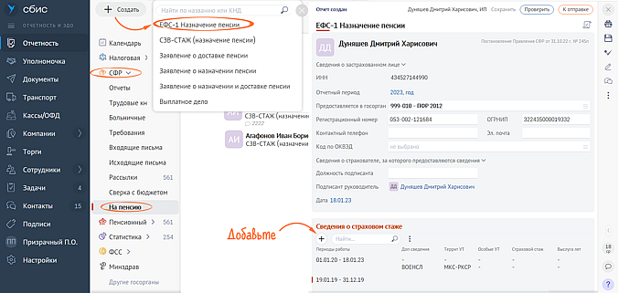 Если вы и раньше отправляли отчетность в ПФР из СБИС, значит, у вас есть доступ к разделу СФР и автоматически появится доступ к форме «ЕФС-1 Назначение пенсии».