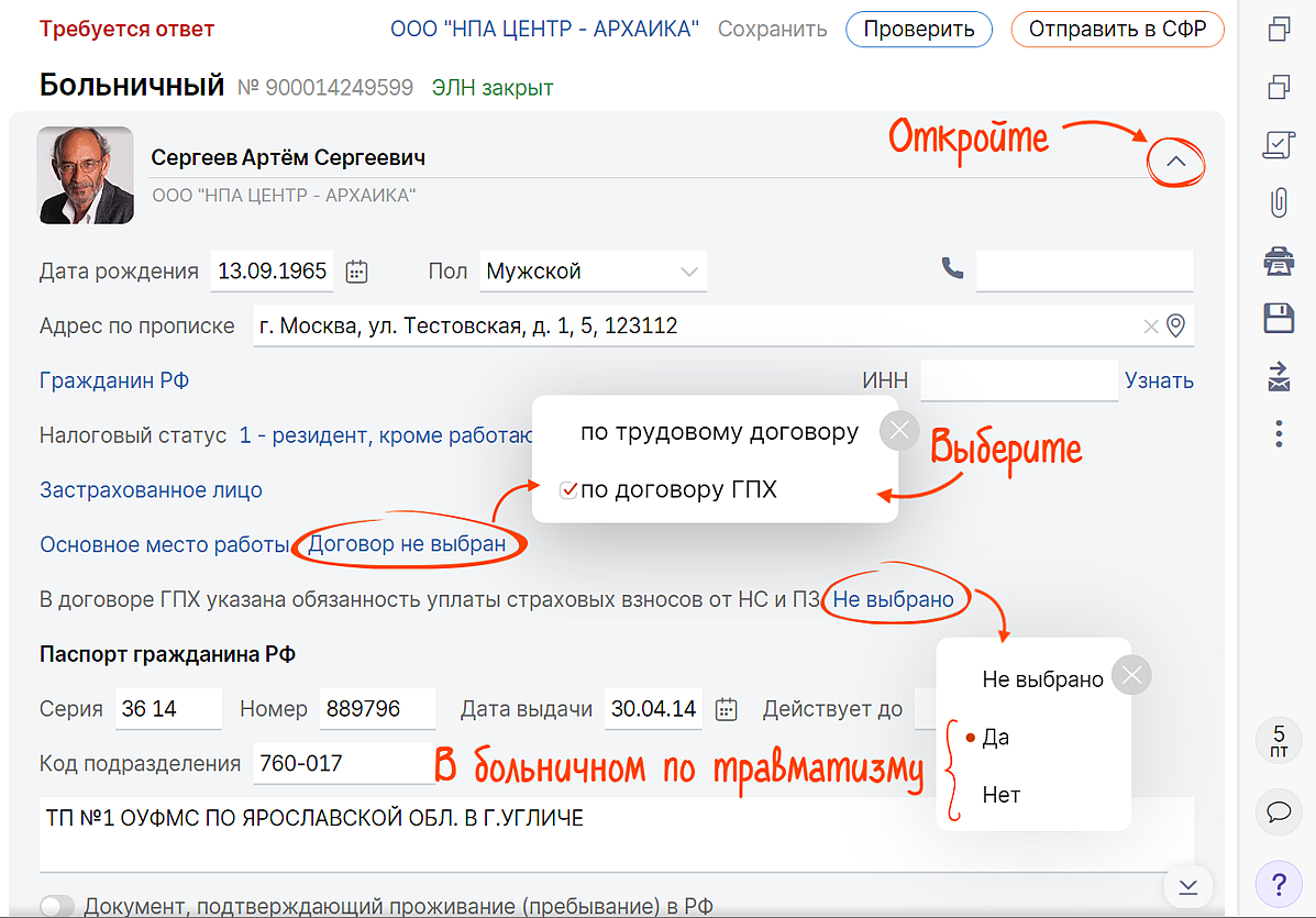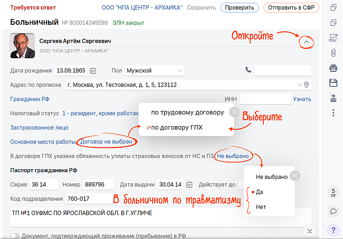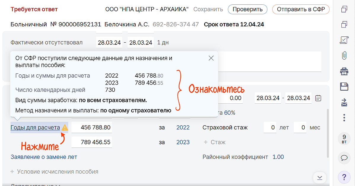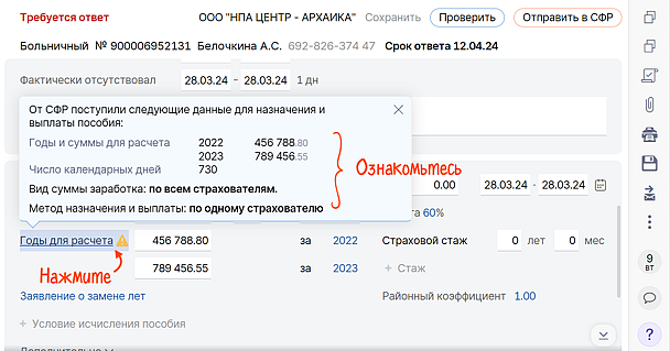 Также мы добавили в больничные подсказки с полезной информацией от СФР. Например, с данными для назначения пособия или сведениями о работе у других страхователей.
