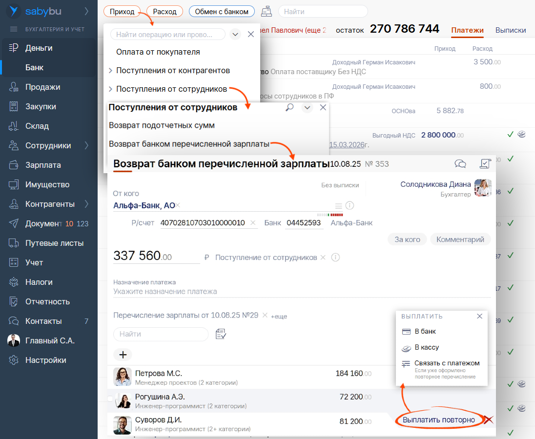 Перечисляйте выплату сотруднику в другой банк или кассу из документа «Возврат зарплаты банком» — повторный платеж автоматически свяжется с ведомостью. Данные по НДФЛ попадут в отчетность по дате нового перевода. Прямо в возврате выберите нужного сотрудника и кликните на «Выплатить повторно». Saby откроет предзаполненный документ для повторного перечисления зарплаты.