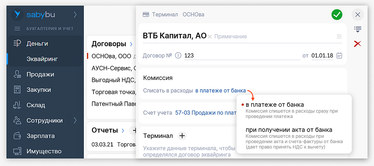 Выберите способ отражения комиссии в карточке договора эквайринга (раздел «Деньги → Эквайринг»). Saby будет по умолчанию применять его при загрузке банковских операций.