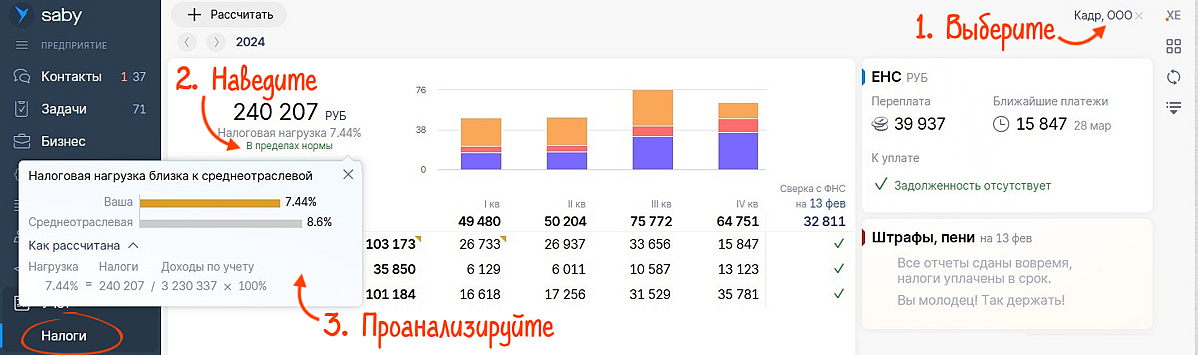 Saby покажет нагрузку в целом по холдингу и отдельно по каждой организации. В разрезе компании она сравнивается со среднеотраслевым значением: чем ниже, тем выше риск проверки.