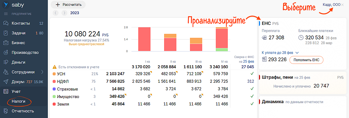 Налоговая нагрузка, доля вычетов по НДС, наличие убытков, рентабельность продаж — в Saby вся эта информация собрана на одной странице. Анализируйте и оценивайте риск возникновения вопросов со стороны ФНС.
