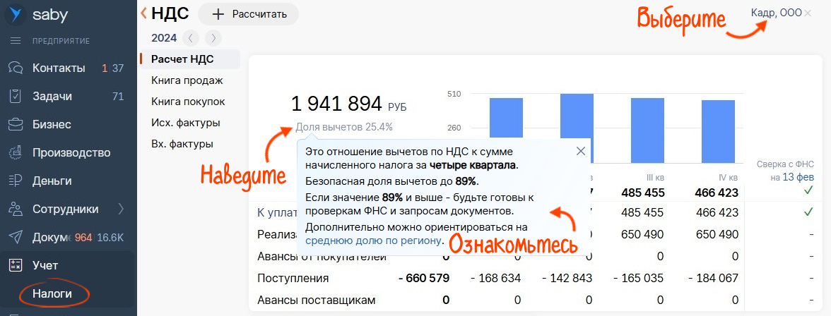 При показателе более 89% — риск проверки выше. Saby рассчитает долю вычетов и вовремя предупредит вас.