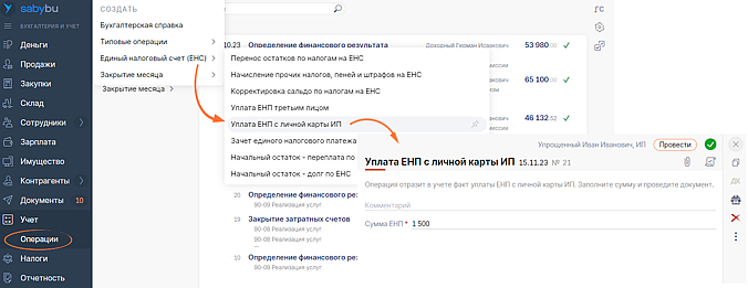 В разделе «Учет/Операции» создайте «Уплата ЕНП с личной карты ИП». Укажите сумму и проведите операцию в учете.
