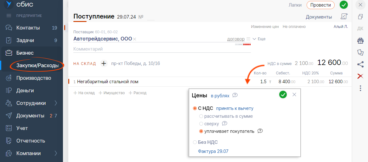 Продаете или покупаете металлолом, макулатуру, шкуры КРС? Вести полный цикл учета: от авансов до отгрузки — теперь легко в Saby (СБИС). Настройте параметры учета и указывайте во всех документах, что налоговый агент по НДС — покупатель.