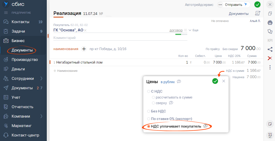 В документе реализации выберите «НДС уплачивает покупатель».