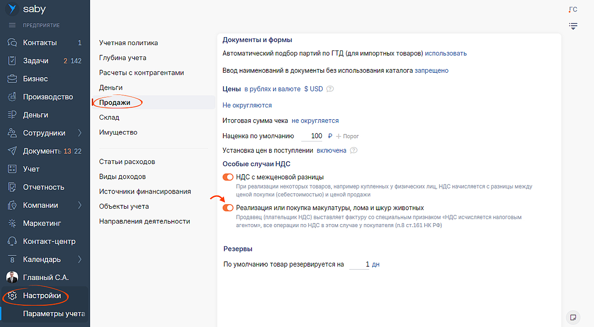 В разделе «Настройки/Параметры учета/Продажи» кликните на переключателе «Реализация или покупка макулатуры, лома и шкур животных».