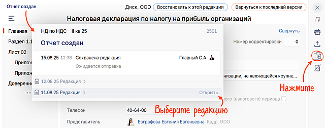 Просто откройте нужную редакцию отчета через статус и нажмите .