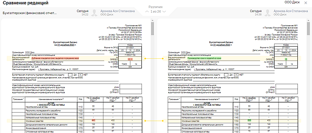 Saby покажет обе версии в печатной форме и выделит различия цветом.