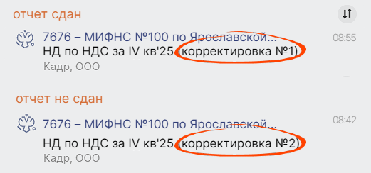 Стало проще отследить, какие ваши корректировки госорган уже принял. Теперь в уведомления об отчетах мы показываем номер корректировки. Даже если у вас их несколько по одной декларации, вы сразу увидите, по каким уже получен протокол.