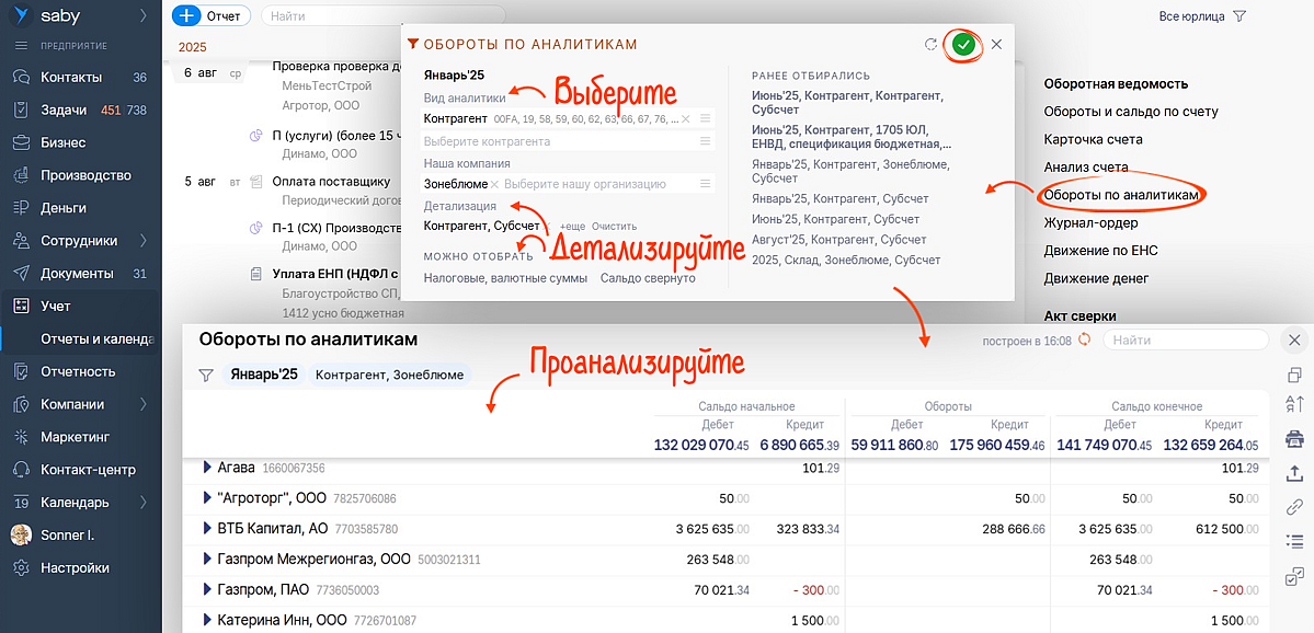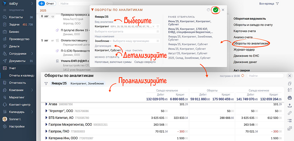 Анализируйте обороты по счетам учета в разрезе конкретных аналитик. Например, по контрагентам, сотрудникам, видам дохода и статьям расхода.