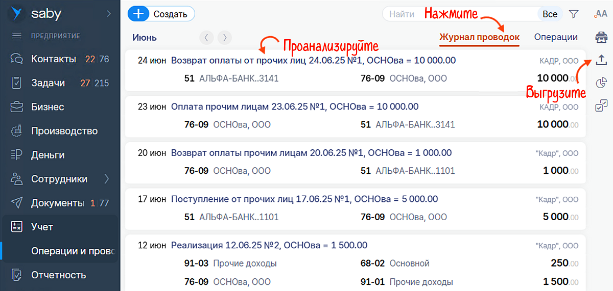 Информация обо всех хозяйственных операциях теперь собрана в отдельной вкладке — «Журнал проводок». Это ускорит и упростит подготовку отчета по проводкам для банка, аудитора или ИФНС.