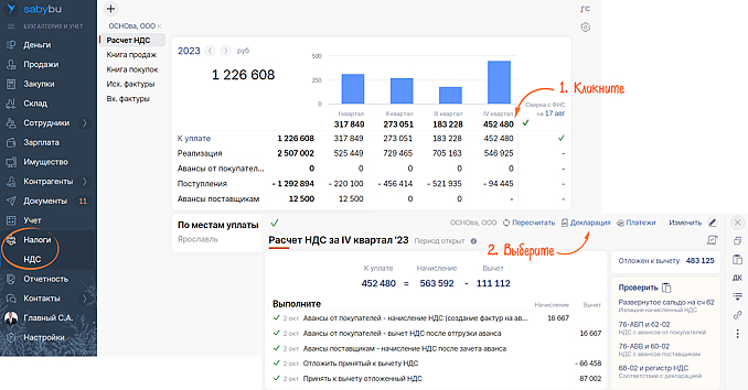 СБИС сам заполнит все необходимые данные — книги продаж и покупок уже сформированы автоматически по данным учета. Система проверит декларацию по контрольным показателям ФНС. Вам останется только подписать отчетность и отправить ее в налоговую.