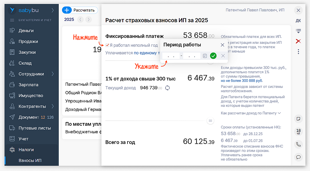Фиксированные — сумма установлена законом (ст. 430 НК РФ). В 2025 году это 53 658 ₽. Если работали не весь год, Saby сам пересчитает взнос — достаточно указать период.