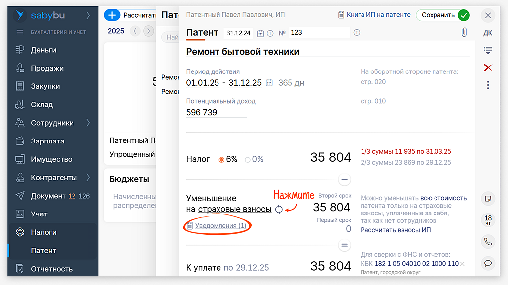 ИП на ПСН без сотрудников могут полностью уменьшить платеж за патент на сумму страховых взносов за себя. Для этого отправьте уведомление в ФНС прямо из карточки патента. Если вы не ведете учет в Saby или у вас несколько патентов, сформируйте уведомление через календарь отчетности.