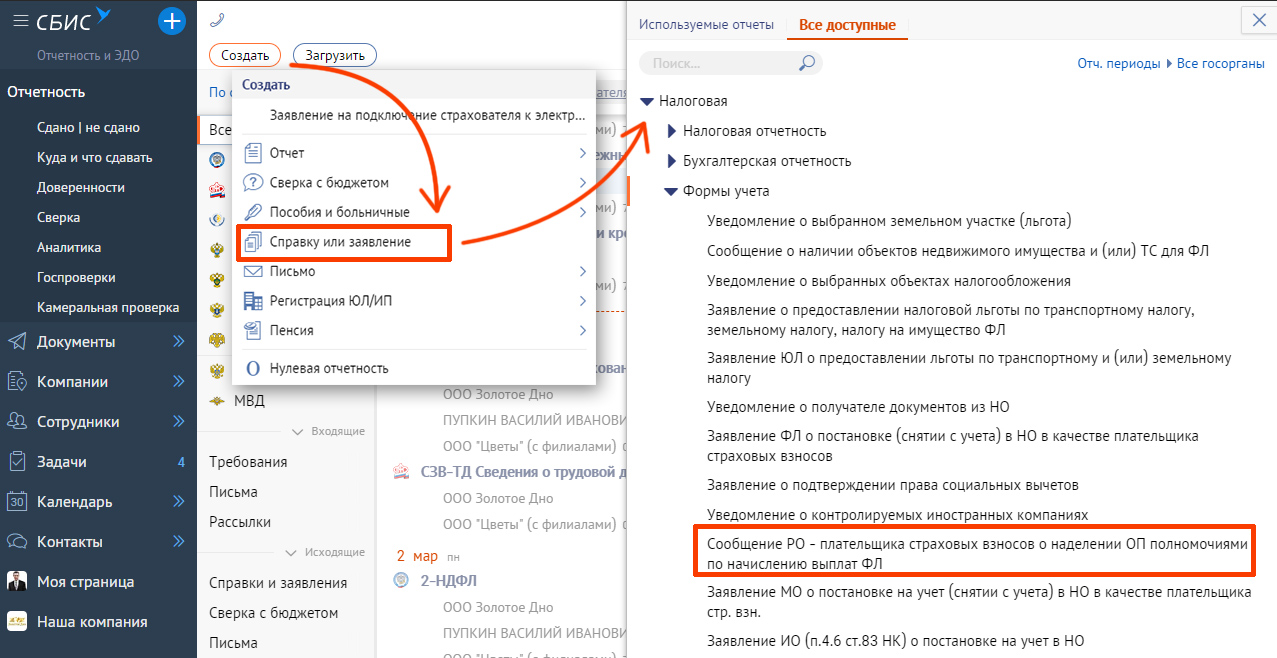 В СБИС уже есть готовый бланк Сообщения РО - плательщика страховых взносов о наделении ОП полномочиями по начислению выплат ФЛ. Просто заполните его, а система сама отправит в нужную налоговую.