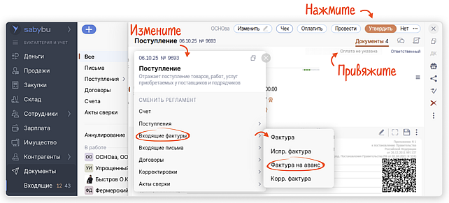 Измените тип документа, если получили его по другому регламенту: выберите фактуру на аванс.