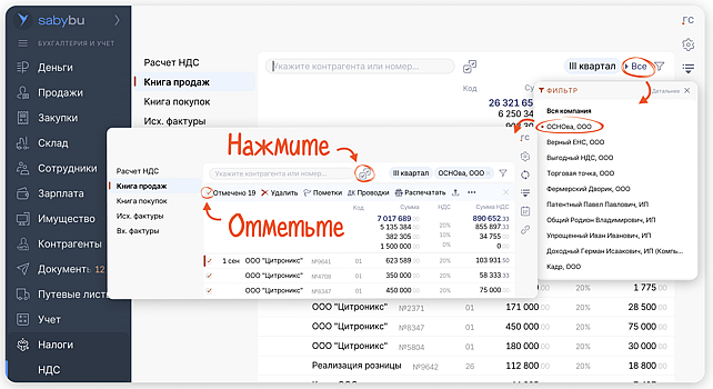 Если в аккаунте несколько организаций — воспользуйтесь фильтром. Чтобы получить книгу по конкретному контрагенту, введите его ИНН или КПП в поисковую строку.