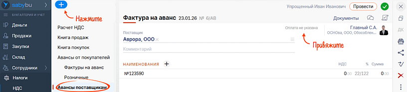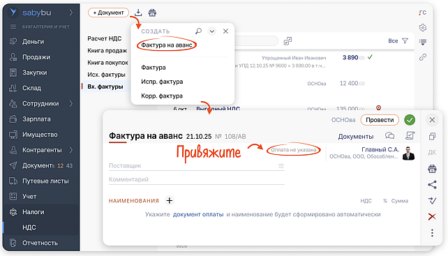 Проведите авансовый платеж, затем рассчитайте НДС в расчете. Saby сам создаст счет‑фактуру на аванс.