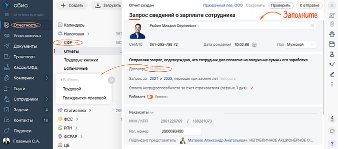 Ответ от фонда поступит прямо в форму запроса по сотруднику. Созданные запросы найдете на вкладке «Отчеты» в разделе «Отчетность/СФР»
