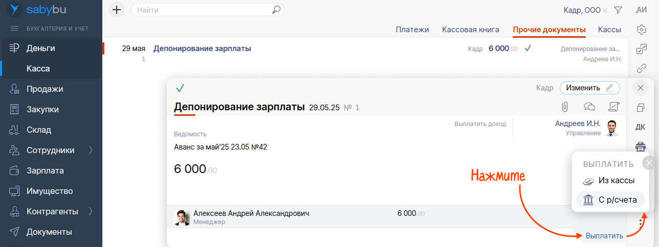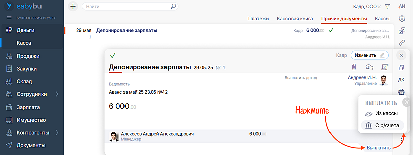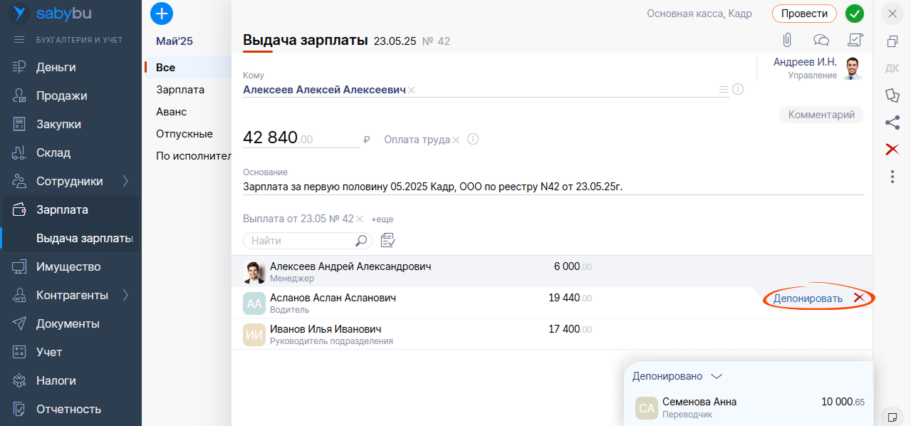 Сделать это можно вручную из реестра прочих кассовых документов или в один клик прямо из диалога расходного кассового ордера. Просто найдите в списке нужного сотрудника и нажмите «Депонировать». Saby переместит его выплату в новый документ, обновит сумму в ордере и сформирует все проводки.