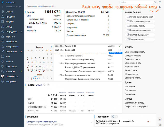 Управляйте деньгами, работайте с поставщиками, контролируйте складские остатки, перечисляйте зарплату, рассчитывайте налоги — доступ к нужному участку прямо из меню по одному клику.