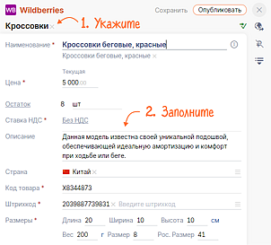 Оформите карточки товаров в СБИС: заполните наименование и характеристики, добавьте фотографии и подтвердите публикацию. Количество товара заполнится автоматически по данным склада.
