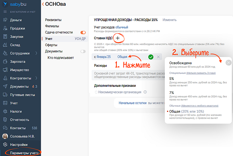 С 2025 года по закону упрощенцы, заработавшие в 2024 более 60 млн ₽, становятся плательщиками НДС. Подробнее об этом мы рассказывали в статье. Выберите ставку и настройте учетную политику.