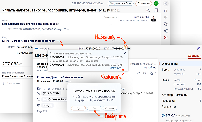В Saby значение КПП уже верное. Если КПП не изменился, обновите его в карточке ФНС вручную.