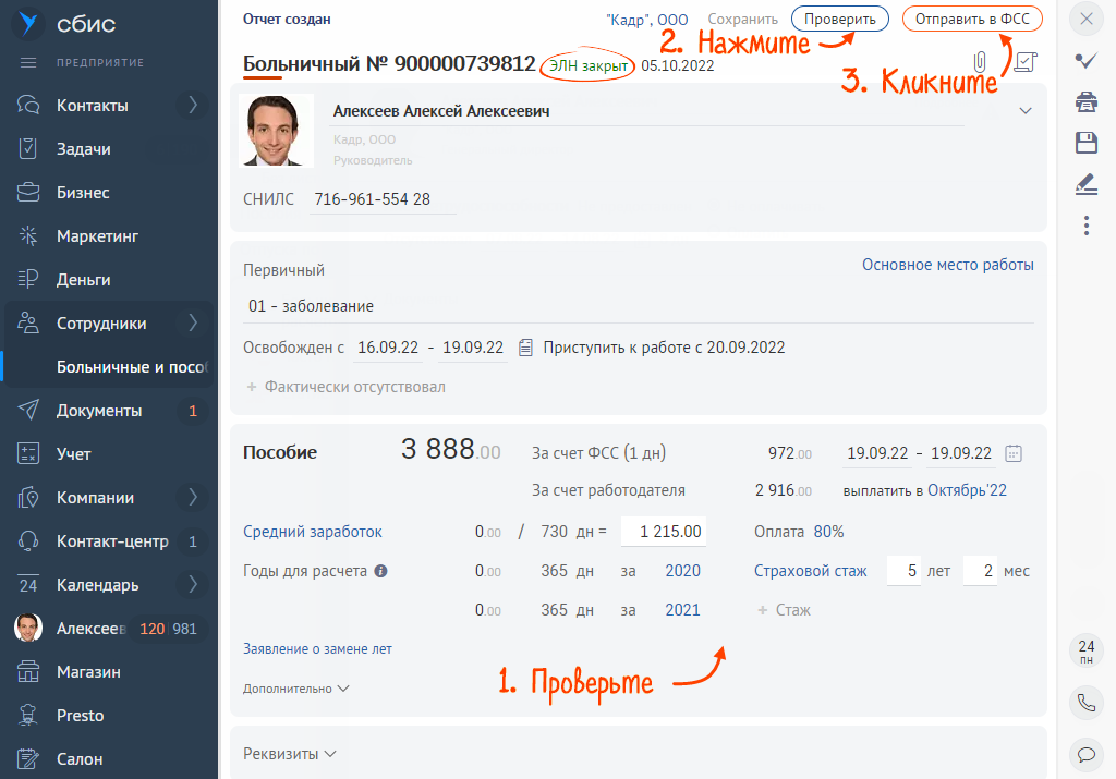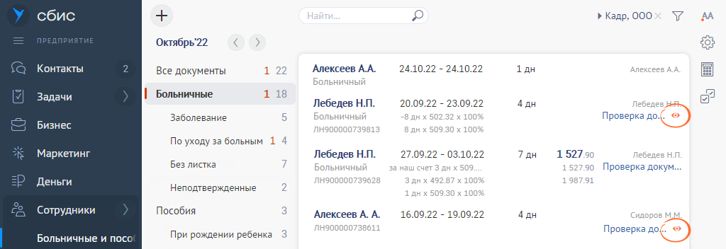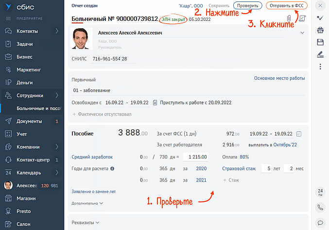 Больше не нужно заполнять карточку больничного вручную — документ сформируется в разделе «Сотрудники/Больничные и пособия». СБИС получает от СФР данные об открытии, продлении, аннулировании и закрытии ЭЛН — вы всегда увидите актуальный статус.