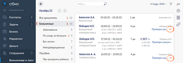 Также система поможет не пропустить сроки. Ответственный сотрудник получит уведомление о поступлении больничного в СБИС и на свою корпоративную почту, указанную в его карточке.