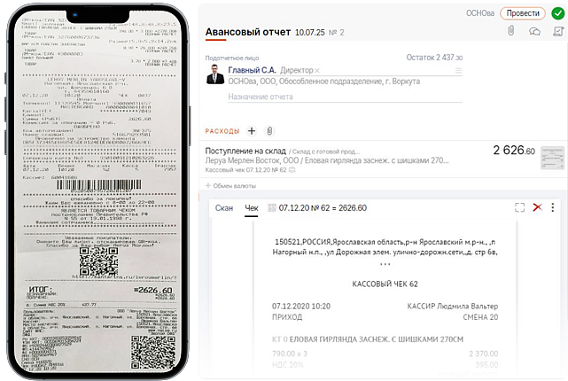Прикрепите фото или скан чека — Saby распознает его по QR-коду, подставит все позиции и заполнит реквизиты. При расчетах корпоративной картой Saby сам заполнит сумму и счет затрат, вам нужно будет лишь выбрать из списка оплату и статью расходов. Выберите, на что потрачены подотчетные деньги: