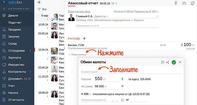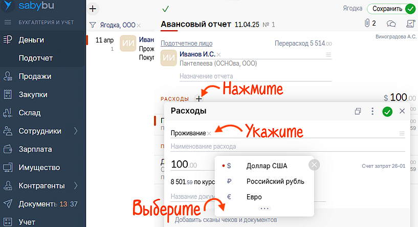 Расходы в валюте. Выберите статью расхода и вид валюты. Saby пересчитает траты в рубли на дату авансового отчета. Курс валюты можно установить вручную.