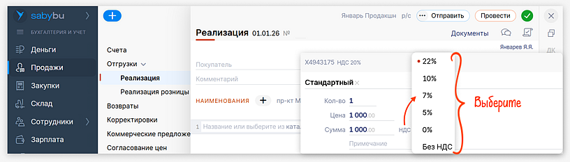 В переходный период для выставления счетов-фактур, включая корректировочные, а также для подготовки декларации за 4 квартал 2025 в Saby доступны обе ставки 20% и 22%.