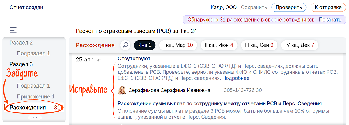 Несоответствие сумм выплат между РСВ и персонифицированными сведениями. Система укажет конкретного сотрудника, по которому есть расхождения, и подскажет, как их исправить в отчете.